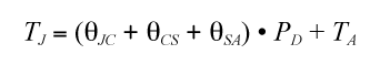图7. MAX2242评估板底层视图 热管理 功率晶体管的集电结耗散大量功率。耗散功率表现为热量,这会使结点温度上升。但是结点温度TJ不能超过额定最大值TJmax;否则晶体管可能永久损坏。即便不出现突然失效的情况,长期可靠性也会受到影响。硅器件的TJmax大约为150℃,作为基于硅材料的器件,MAX2242以150℃或TJmax作为它的最高结点温度。 MAX2242直接用评估板的地平面作为散热器。 图8用等效电路的形式表示热传导过程。功率耗散与电流对应,温度差与电压差对应,热阻与电阻对应。