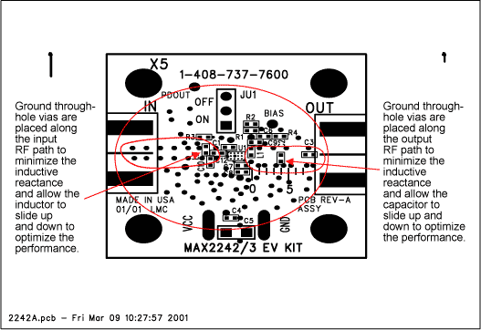 图1. MAX2242评估板顶层元件层视图 级间匹配 由于级间匹配使部分匹配,多级放大器的外部级间匹配非常严格。为优化前级驱动和驱动放大器需要少量的电感,集总参数形式或分布参数形式均可。