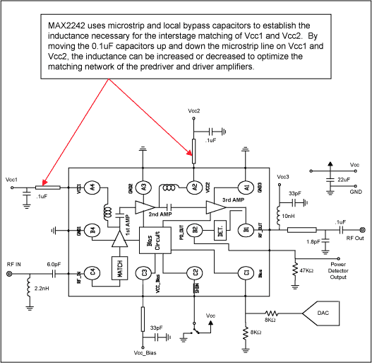 图5. 最佳信号源和负载阻抗 瞬态稳定性 另外一个需要关注的问题是改善瞬态稳定性。按照以下设计准则设计将避免MAX2242出现不稳定。 首先,在主Vcc输入端与地之间放置一个大的全局旁路电容(钽电容或电解电容),以避免电路出现振荡趋势。在其它Vcc输入端增加局部退耦电容可以阻断与电源有关的反射。 电源的偏置引线需要加适当的屏蔽,以防寄生RF信号耦合到偏置电源。这对于串联增益为30dB或更高的多级PA尤为重要。电源偏置的屏蔽可以通过隔离开各个Vcc引线实现,如果可能的话,将Vcc引线布在寄生信号最弱的底层地平面上,或布在电路板上寄生信号最弱的其它层面上。 高增益多级放大器容易受到反馈的影响,这种反馈是由输出信号耦合到输入通道引起的。电路会在相位差达到180度的频点发生振荡。为了将输出耦合到输入的RF信号降至最小,建议RF信号走线尽可能短,以减小天线效应。 最后,电路板接地不良也会引起振荡。PA的大电流流经阻抗不为0的地线会将电压差和注入噪声引入地线系统。