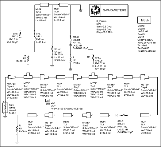 图2. MAX2242应用电路图 输入输出阻抗匹配 输入输出阻抗匹配通过两个重复操作过程实现。第一步通过小信号仿真;第二步在大信号条件下根据实验经验调节。 图3和图4所示为按照实际电路板尺寸得到的集总和分布元件模型,它们组成了最佳输入输出匹配网络。 图5是根据实际电路板仿真得到的最佳信号源Z(1,1)和负载Z(2,2)的阻抗。将Z(1,1)和Z(2,2)作为最佳信号源和负载阻抗的起点。